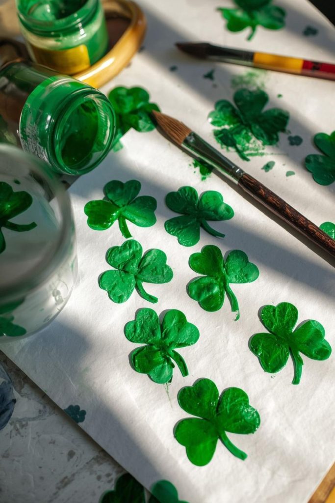 - Cut out multiple shamrocks from green paper.
