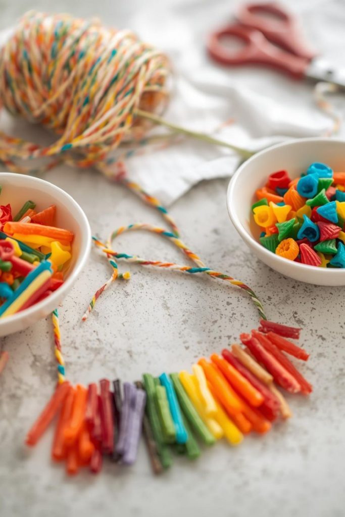 6. St Patrick’s Day Rainbow Necklaces Using Colored Pasta