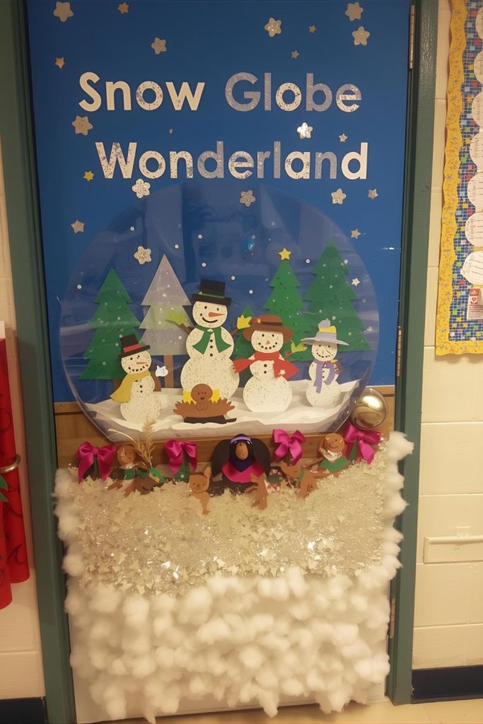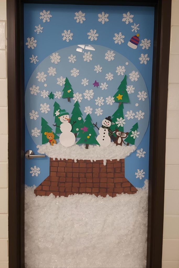 Imagine walking into a giant snow globe every morning. For this, cover your classroom door with light blue paper or wrapping paper. Cut a large circle from white or clear plastic to act as the globe. Add cotton batting at the bottom to resemble snow. Let students cut out winter-themed paper characters—snowmen, trees, little animals—and place them inside the circle. Sprinkle glitter for extra sparkle. Tape or tack the circle onto the door. To make it interactive, have each student write their name on a small cut-out snowflake and add it inside the globe, making it feel like they’re part of the scene.