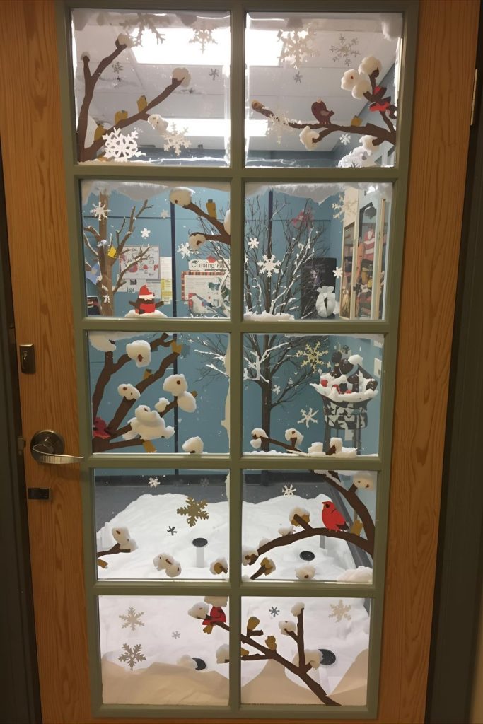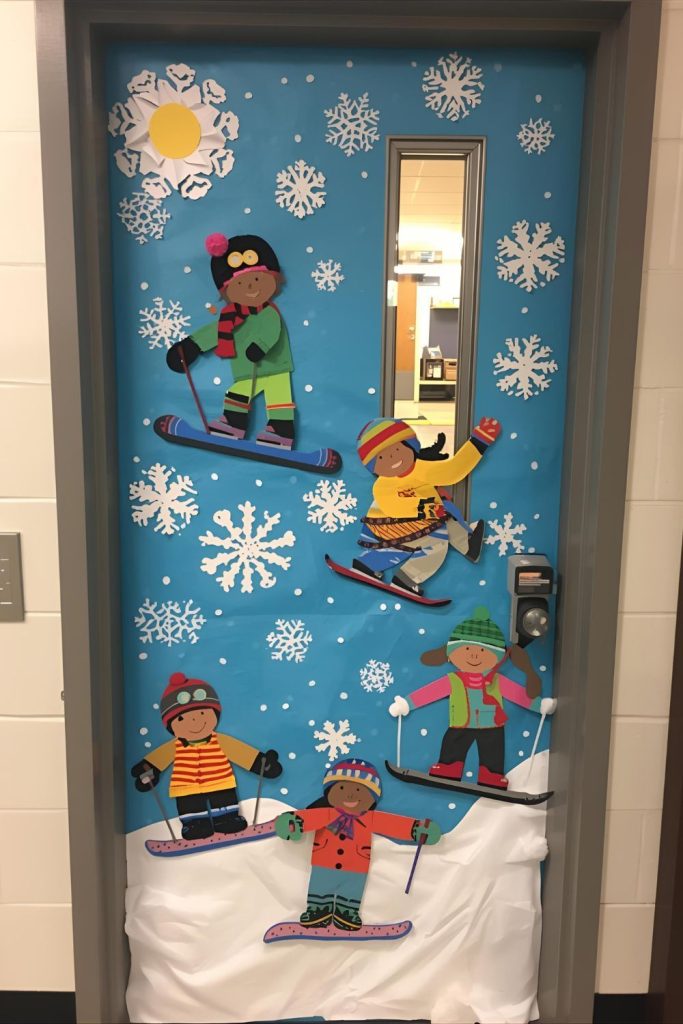 Celebrate winter fun. Cover door with snowy background. Students make cutouts of winter sports: skiing, ice skating, snowboarding. Arrange them on door as if moving across a hill or ice rink. Add snowflakes and cotton for texture.