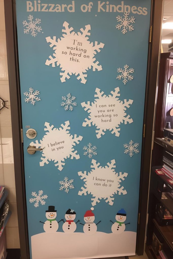 Turn your door into a kindness storm. Cover the door with light blue paper. Have students cut out paper snowflakes and write kind messages or compliments on each. Tape or tack the snowflakes across the door in a scattered, swirling pattern. Add small snowmen or winter characters peeking from behind some snowflakes to make it playful. This not only decorates the classroom but also encourages positive interactions.