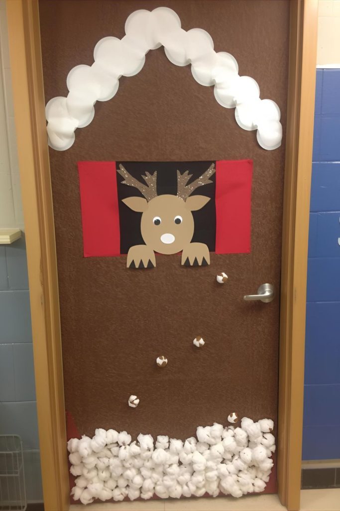 Create a playful farm scene for your door. Cover the door with light blue or snowy background paper. Make a simple brown barn with roof and windows. Students can make paper reindeer and attach them around the barn, some peeking out of windows or doors. Use white paper or cotton to create snow on the roof and around the base. You can even make antlers from yarn or brown strips of paper to give texture.