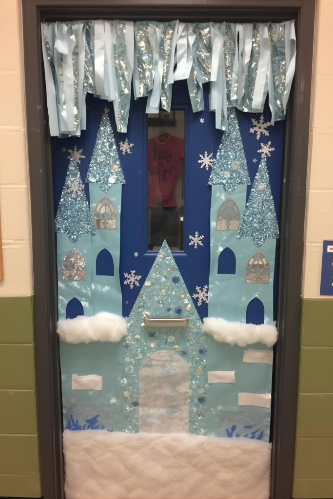 Bring icy magic to your hallway. Use shiny blue or silver paper for the door background. Create towers and castle walls using light blue paper. Cut icicles from clear plastic or silver paper and attach them to the top. Students can make paper snowflakes or icy banners to hang around the castle. Add glitter for shimmer and snowflake confetti for sparkle.