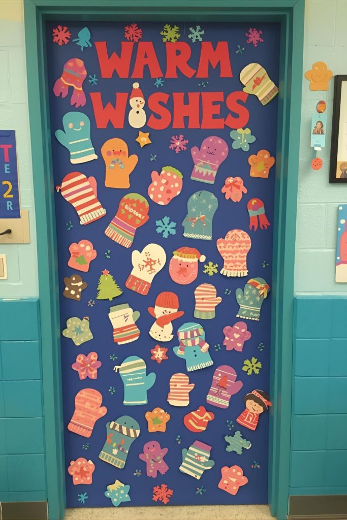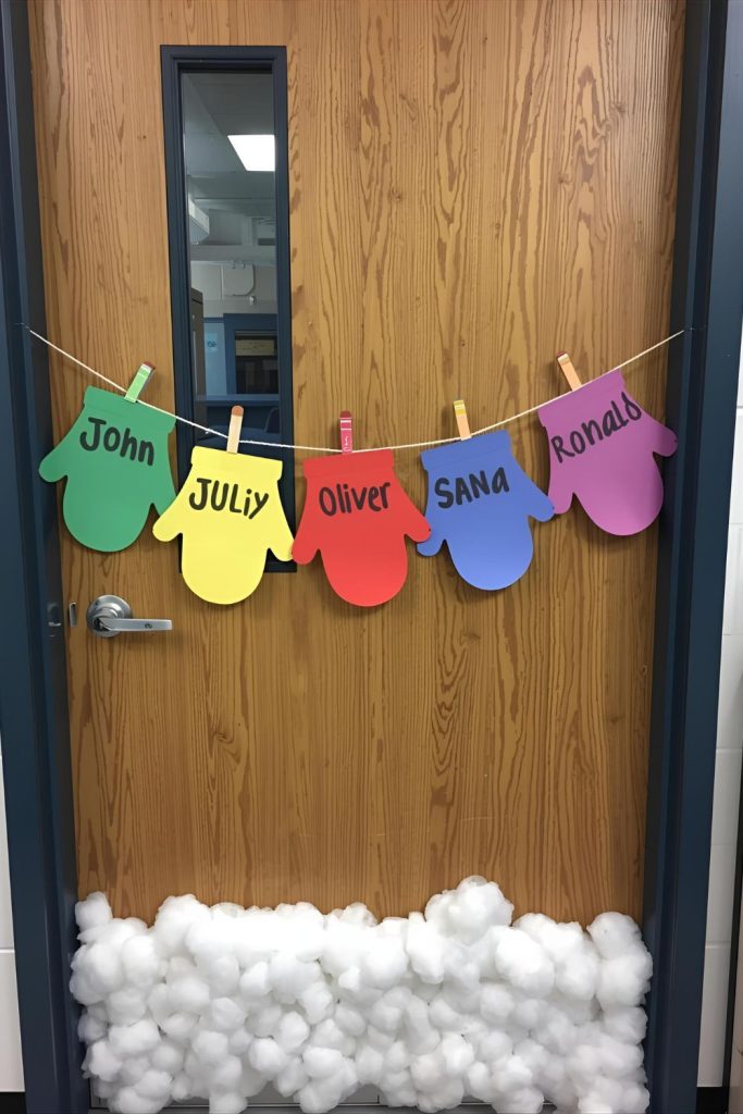 A fun interactive door idea. Cover the door with a solid background. Have students decorate paper mittens. Punch holes and string them on yarn or string across the door like a clothesline. You can overlap mittens slightly for depth and vary colors to make it festive. Students’ names can go inside mittens or on small tags attached.