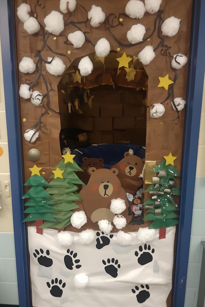 Turn your door into a sleepy winter scene. Cover it with brown paper to act as a cave wall. Cut white cotton snow for the ground outside the cave. Students can make paper bears or other hibernating animals and attach them inside the cave. Add pine trees, snowflakes, or little footprints leading to the cave for storytelling effect.