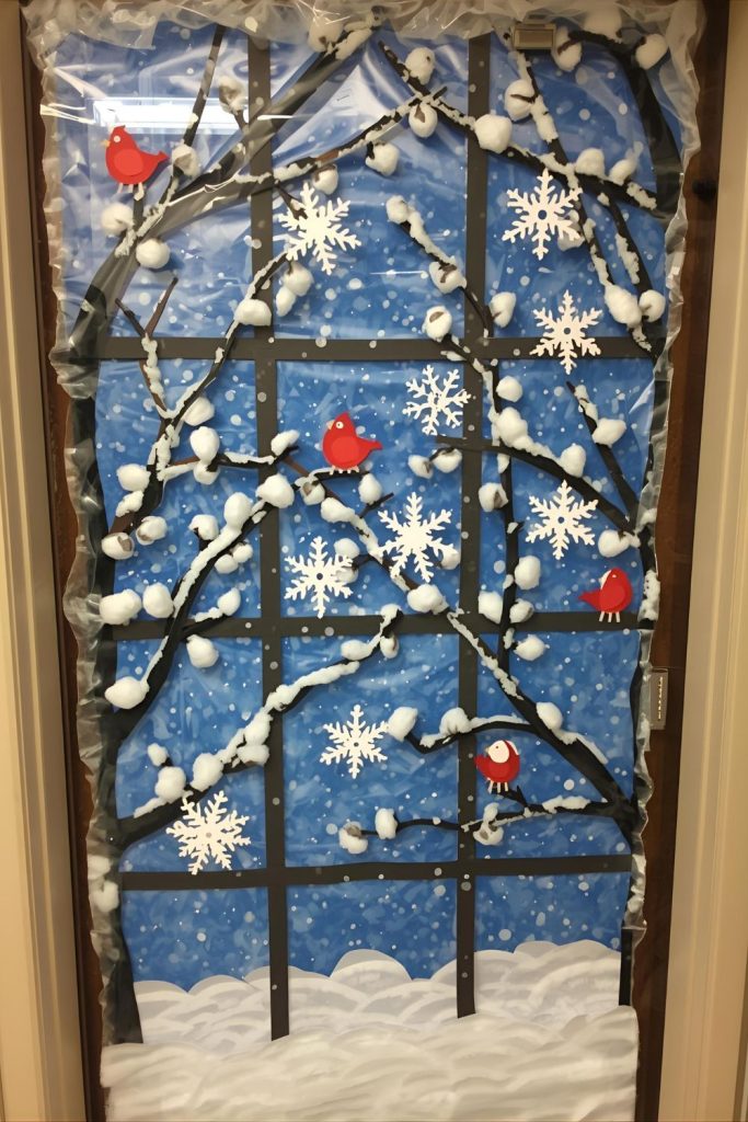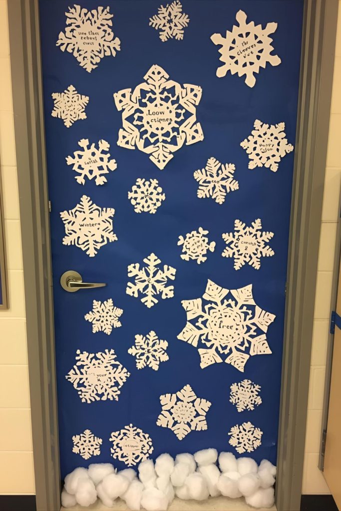 Turn math and science into decoration. Cover the door with a cool blue background. Students cut out paper snowflakes and write one fun fact about snow, winter animals, or weather on each. Arrange the snowflakes across the door in swirling patterns. Add 3D cotton snowballs to make it pop.