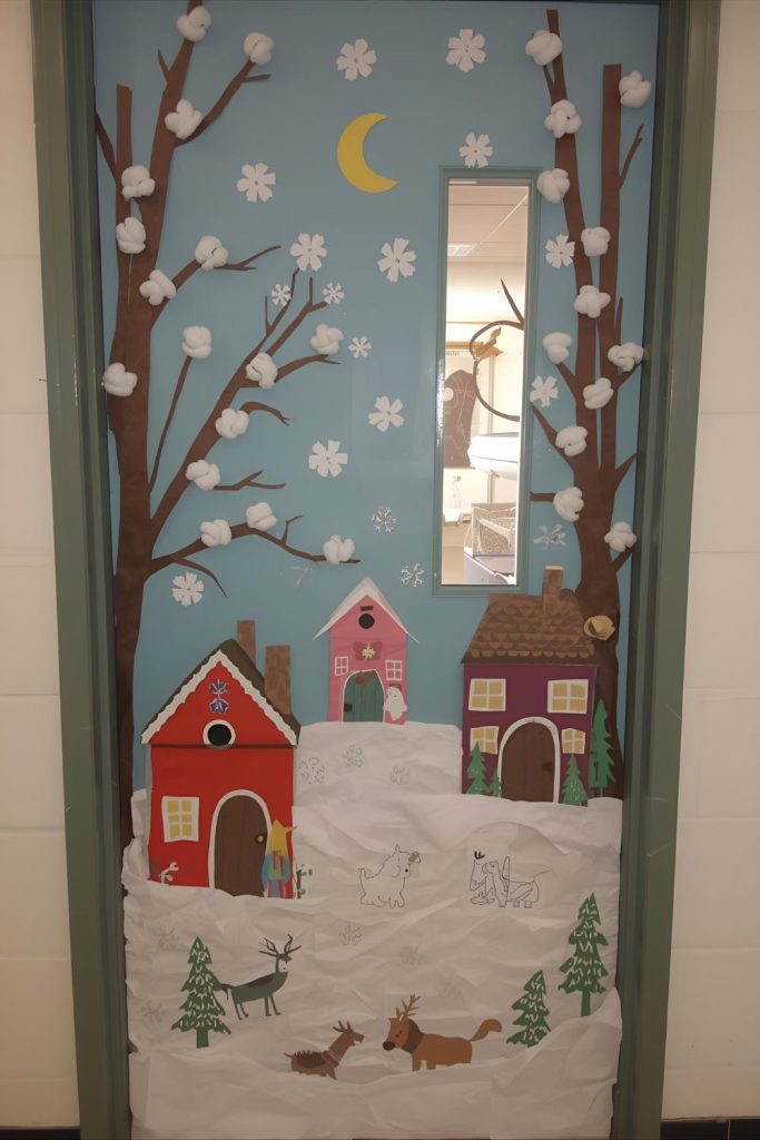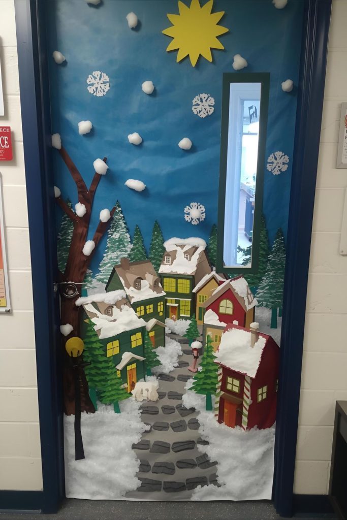 Create a charming mini town. Cover the door with light blue or white paper. Have students make small houses, trees, and streetlamps from paper or cardstock. Arrange them along a “street” on the door. Add cotton for snow on rooftops and along the street. Optional: add small paper cars or animals to add life.