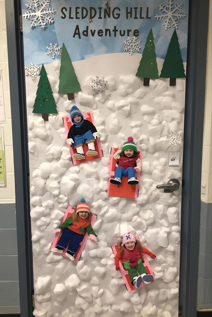 Cover door with white paper for snow. Cut a curved hill shape from white or light gray paper. Students can make sleds with their names or faces on them. Tape sleds onto the hill as if sliding down. Add small trees or snowflakes in the background for depth.