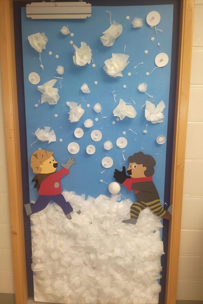 Cover door with blue background paper. Students make small crumpled tissue balls to represent snowballs. Attach paper kids or winter characters having a playful snowball fight. You can create motion lines with white paper or markers for effect.