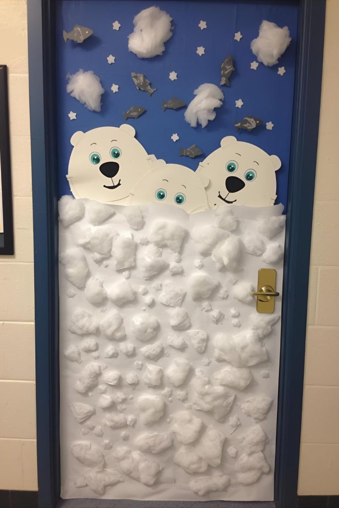 Create playful peekaboo bears. Cover door with icy blue background. Students make polar bears peeking from behind snow mounds or ice blocks. Add cotton snow for texture and paper fish for extra detail.