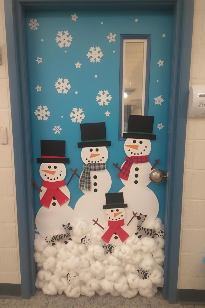 Cover door with white background. Students make snowmen cutouts of varying sizes. Decorate with scarves, hats, buttons, and faces. Arrange snowmen marching across the door like a parade. Add snowflakes or small animals for effect.