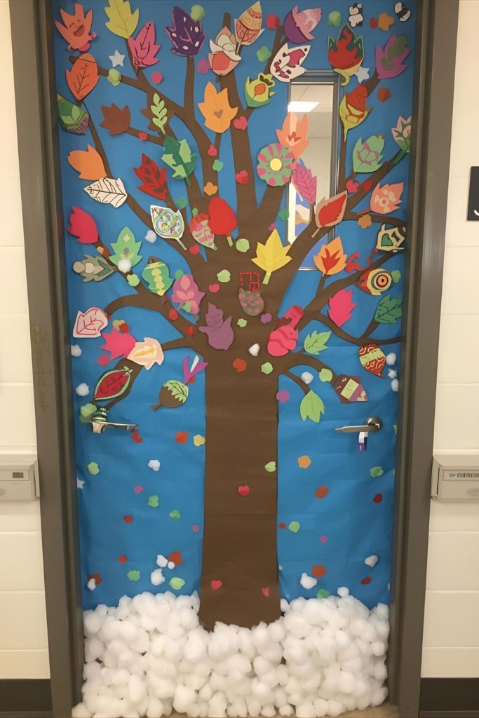 Cover door with blue or snowy background. Make a tree trunk and branches with brown paper. Students create paper leaves or ornaments with things they’re grateful for. Attach to branches and sprinkle cotton snow around.