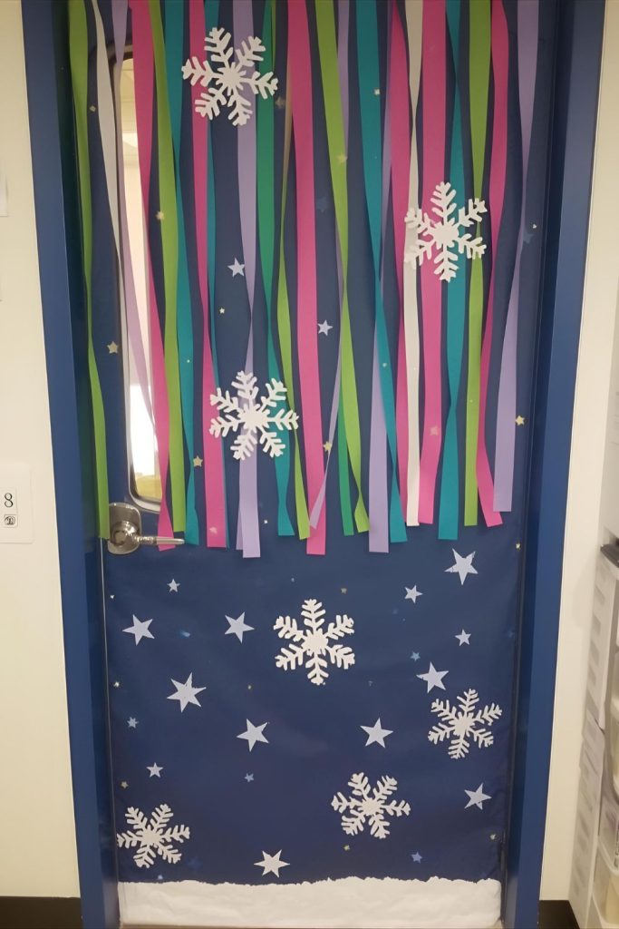 Create a magical night sky. Cover door with dark blue or black paper. Students use tissue paper strips in green, purple, and pink to mimic northern lights. Add white snowflakes or stars with paper or markers for depth.