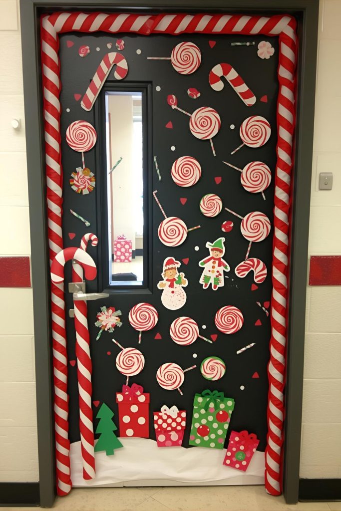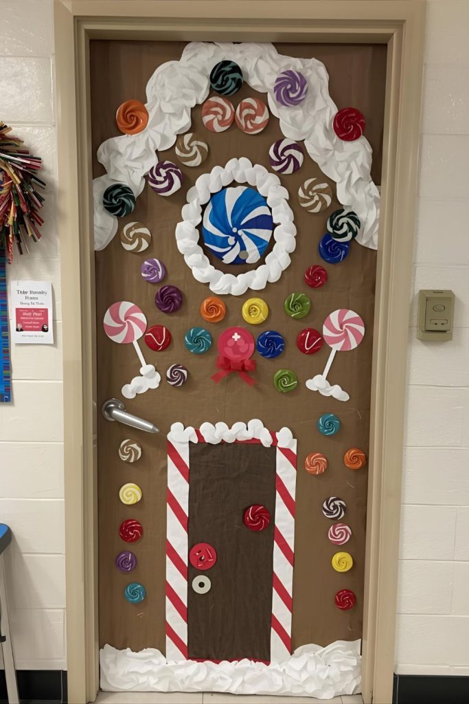 Cover door with red and white striped background. Students create candy canes, lollipops, and gingerbread decorations. Arrange along “street” across the door. Optional: add small paper elves or gifts.
