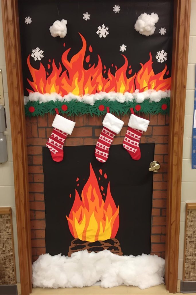 Bring warmth to winter. Cover door with brick or brown paper for fireplace. Use red, orange, and yellow paper for flames. Students create stockings, logs, and small winter items to hang around fireplace. Add cotton snow for contrast outside.