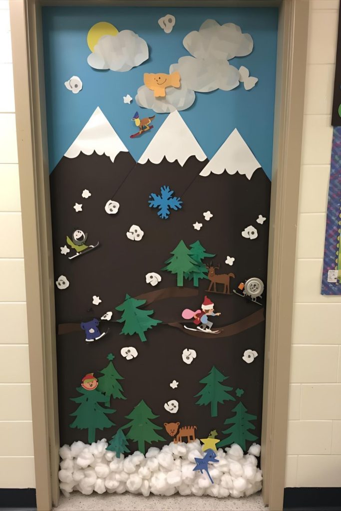 Create a mountainous door. Cover door with light blue background. Cut white paper triangles for snowy peaks. Students add skiers, animals, or trees on slopes. Add cotton for snow texture at the base.