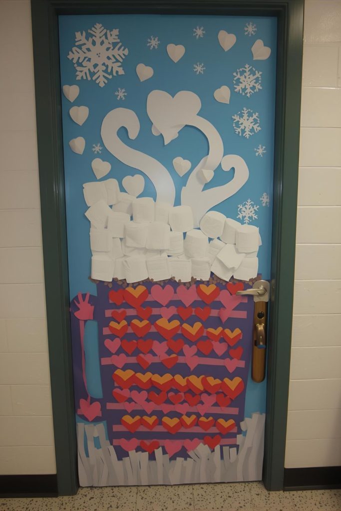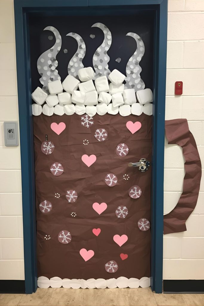 Nothing says winter like a steaming cup of cocoa. For this decoration, start by cutting a huge mug from brown paper to fit your door’s height. Use white paper or cotton balls for marshmallows on top. Draw steam swirling upward with white markers or yarn. Students can add mini paper hearts or snowflakes floating around the steam. For a playful touch, write fun “flavors” like chocolate chip or peppermint on small tags hanging off the mug. This is a perfect interactive activity—students can stick their names on marshmallows as part of a class celebration.