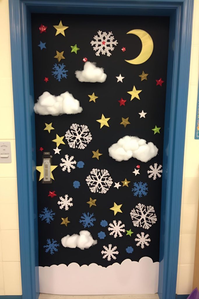 Cover door with dark blue or black paper. Students cut out stars and moons, attaching them to background. Add small paper snowflakes falling across door. Optional: layer cotton clouds or snow for 3D effect.