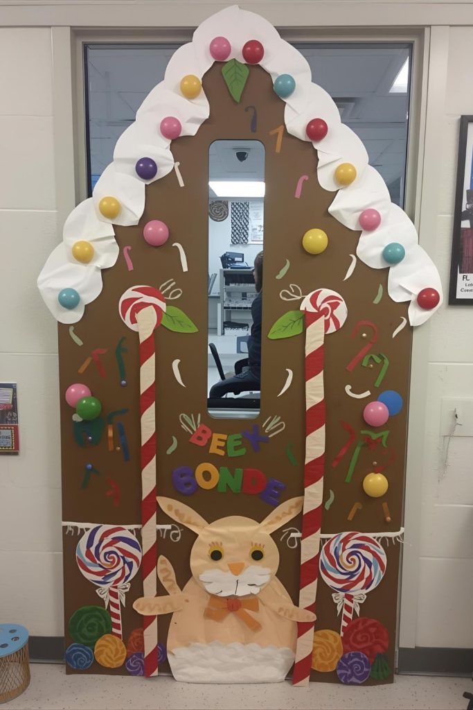 Bring holiday sweetness to your hallway. Cover your door with brown paper to act as the house walls. Use white paper strips, cotton, or ribbon to create “frosting” along the edges. Cut candy shapes from colored paper or use foam stickers for gumdrops, candy canes, and lollipops. Students can make small paper gingerbread people to stick around the door. You can even make a door “window” with yellow paper to mimic glowing light from inside.