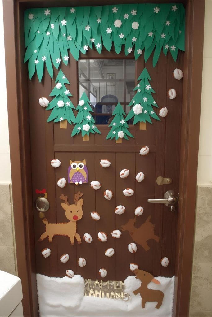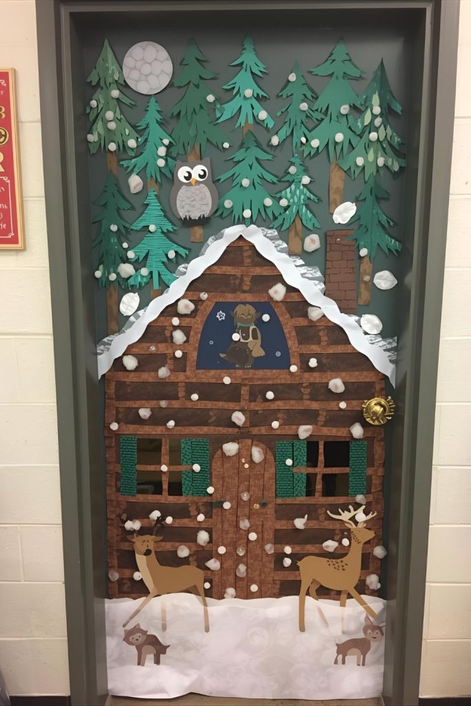 This door transforms into a peaceful forest retreat. Start with brown paper for the cabin walls. Add a “roof” with darker brown or black paper. Cut small squares or rectangles for windows and doors, letting students decorate them with curtains or paper flames in the fireplace. Surround the cabin with green paper pine trees dusted with cotton for snow. Add woodland animals made from paper, like owls, foxes, or deer, for an extra touch of life.
