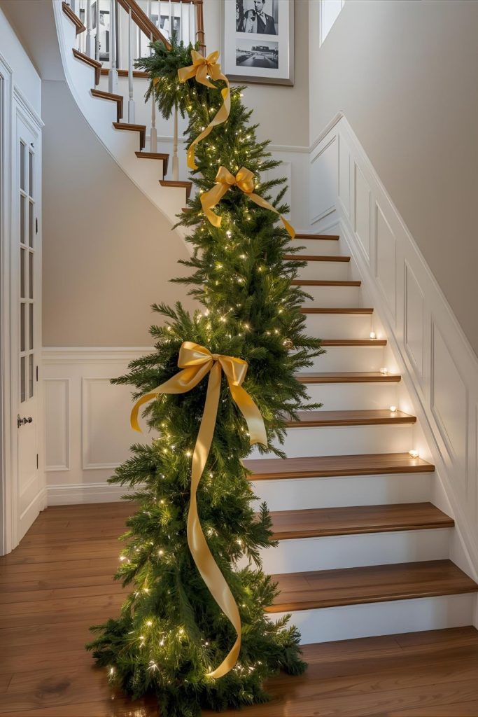 Garlands wrapped in soft lights on your staircase create a welcoming, festive atmosphere. This decoration blends natural greenery with subtle illumination, perfect for showing off your elegant Christmas decor as guests arrive.