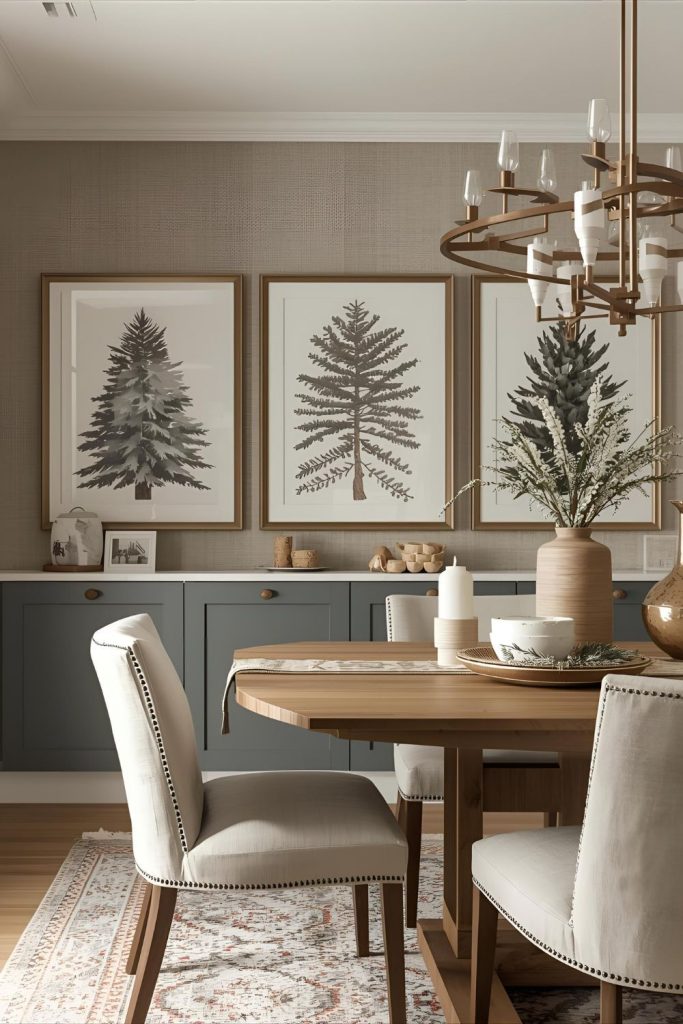 Wall art featuring holiday themes or neutral seasonal designs can bring your dining room or kitchen to life. Choose pieces that reflect your color scheme and style to tie your elegant Christmas decor together.