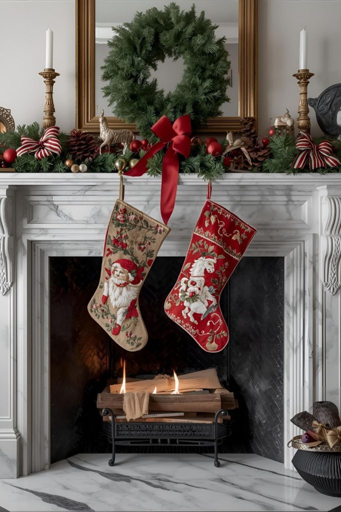 Designer stockings crafted from velvet, silk, or embroidered fabrics add a Victorian touch to your mantle. Look for rich colors and intricate details like lace or beading to add an old-world charm that pairs perfectly with other elegant Christmas decor on display.