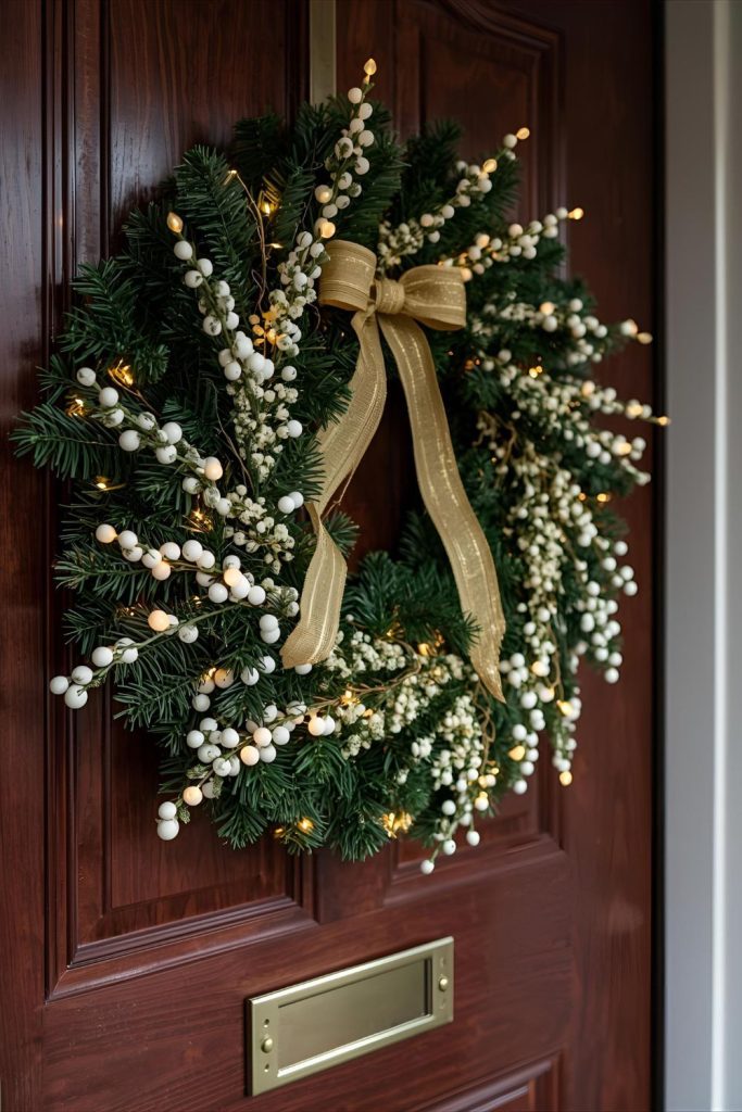 Your front door sets the first impression. A wreath combining classic greenery with white berries, pinecones, and subtle gold touches fits beautifully with elegant Christmas decor styles. Add a simple bow or delicate lights to brighten your porch and welcome guests.