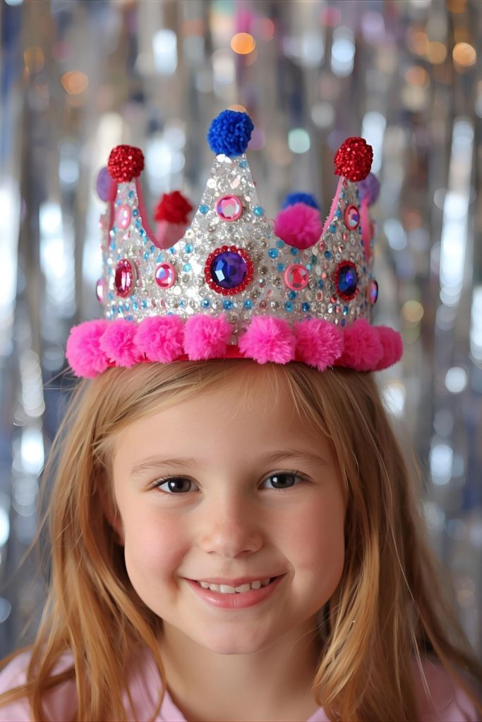 Create a crown kids can wear during celebrations. Gather cardstock, glue, sequins, gems, and pom-poms.