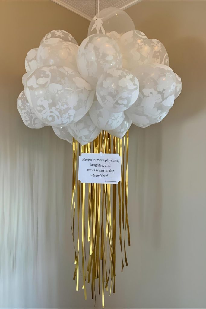 Hanging Goal Balloon Cloud with Gold Ribbon Trails