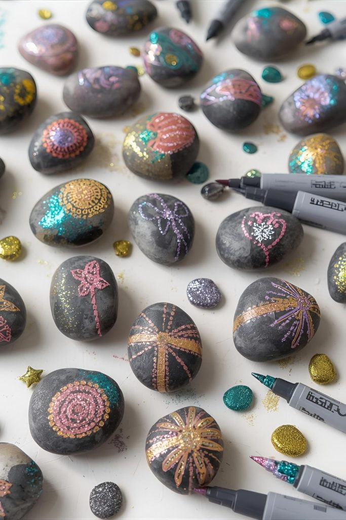 Painted Memory Rocks with Metallic Pens and Glitter Accents
