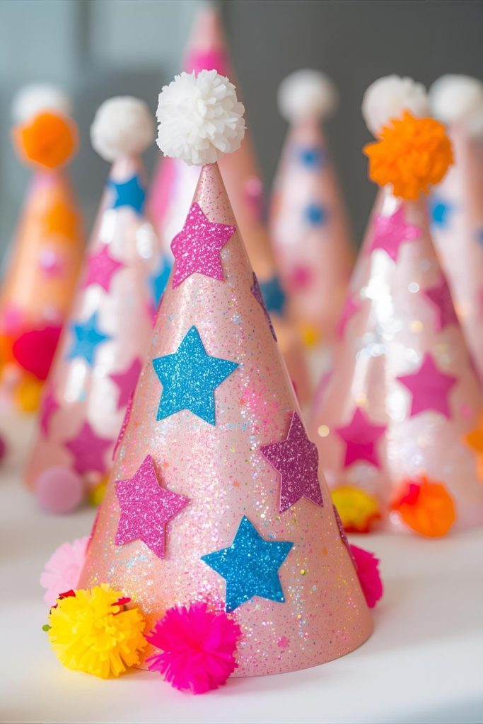 Glittered Paper Party Hats with 3D Stars and Pom-Poms