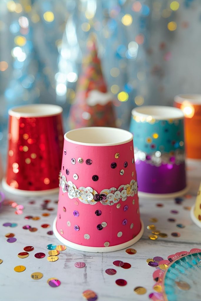 Paper Cup Noisemakers Decorated with Sequins and Metallic Tape