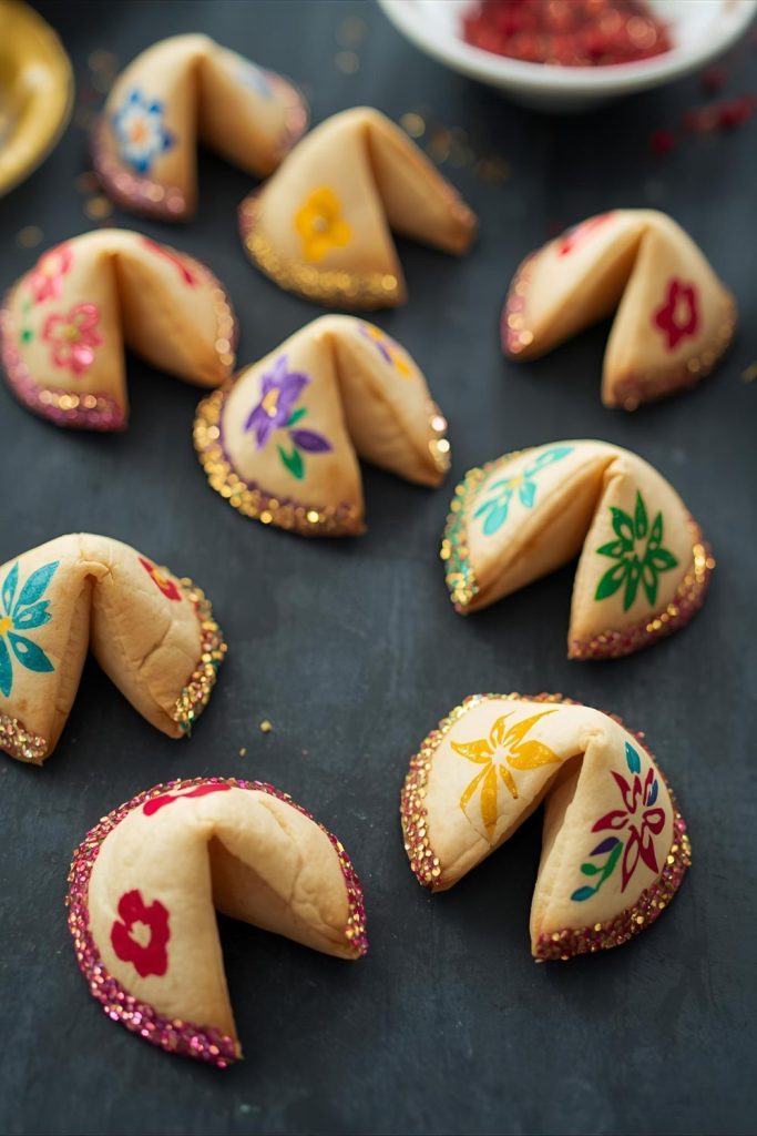 Handmade Fortune Cookies with Painted Designs and Glitter Edges