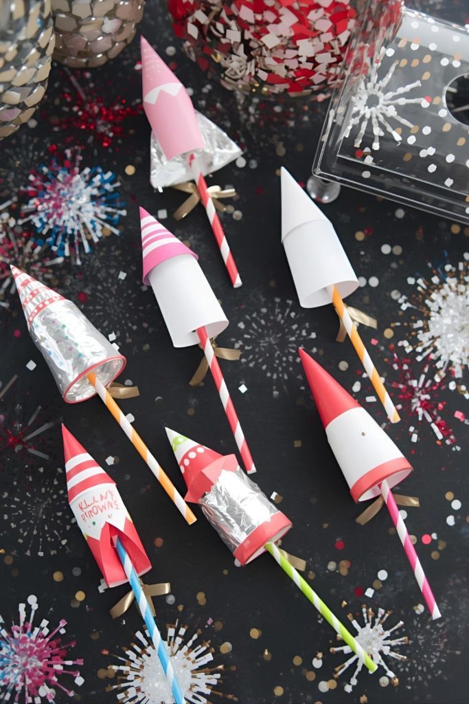 DIY Mini Rocket Fireworks with Paper, Straws, and Foil Accents