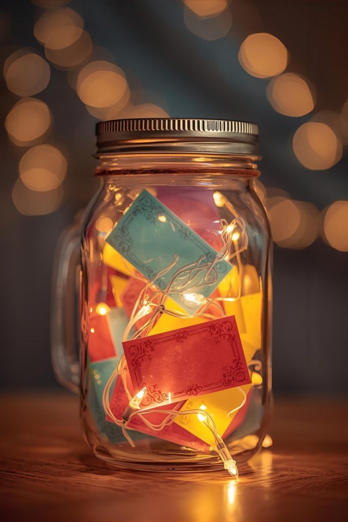 Capture memories and happiness in a jar. Gather a mason jar, LED fairy lights, paper slips, and pens.
