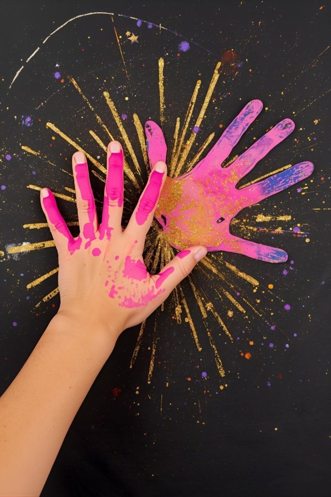 Handprint Firework Explosion on Black Paper with Metallic Paint