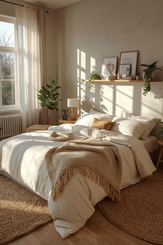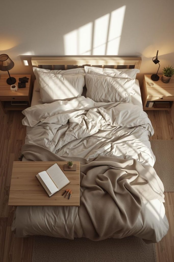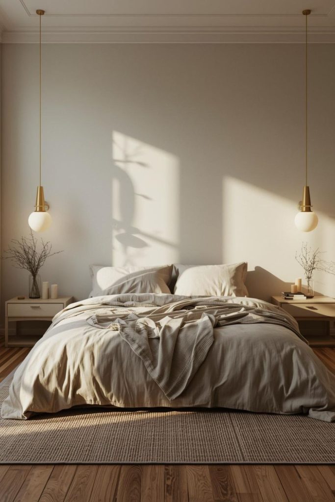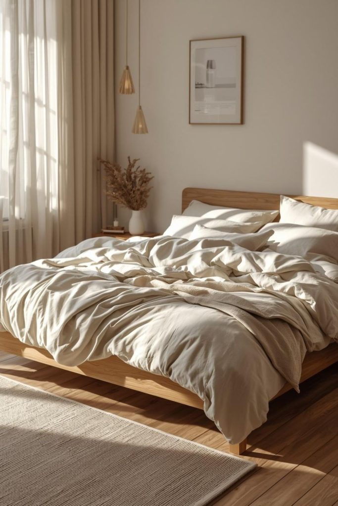 A soft neutral palette instantly sets a calming mood, while layered linen bedding adds texture and coziness. A minimalist oak bed frame keeps the focus on simplicity and elegance, creating a refined focal point. Warm lighting from bedside lamps and subtle overhead fixtures enhances comfort, creating a soothing ambiance for relaxation. Neutral-toned rugs or curtains complement the bed and furniture, adding cohesion without overwhelming the senses. Accessories in muted shades, like ceramic vases or natural wood accents, maintain calm and stylish harmony throughout the room, making it feel inviting and balanced.