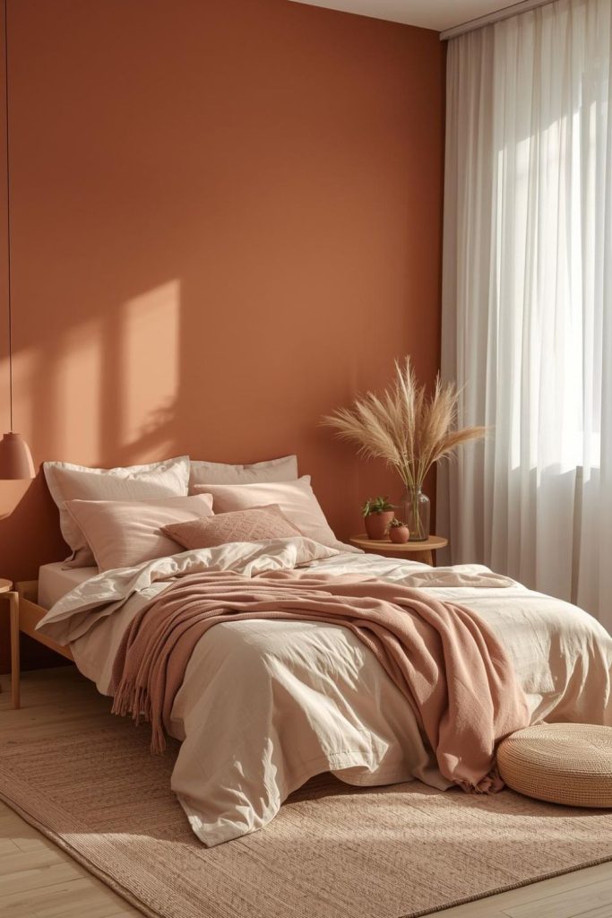 Adult bedroom ideas for women using warm terracotta and blush tones paired with natural materials for a grounded aesthetic