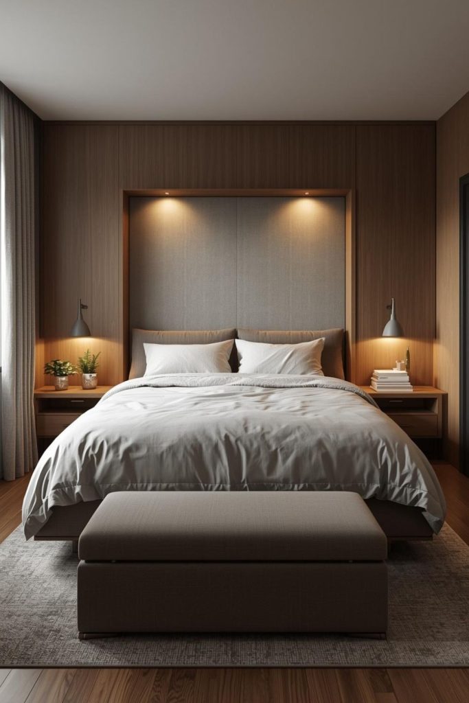 Grouping storage pieces along one wall and keeping surfaces clean prevents clutter. Lighting should be layered: overhead lights, bedside lamps, and accent lights create flexibility and ambiance.