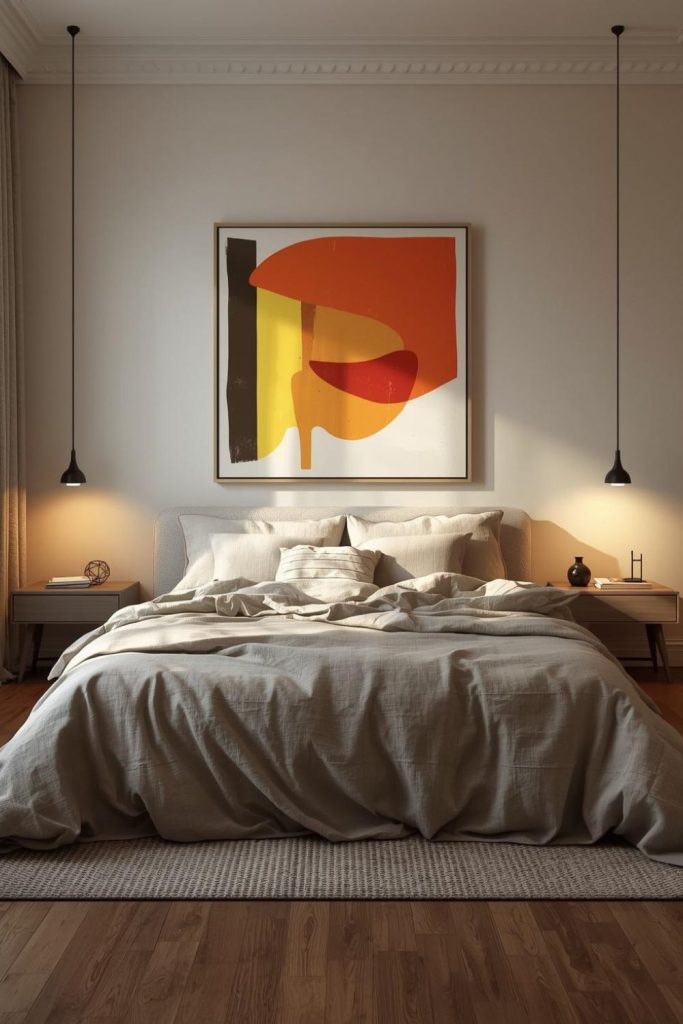 Bold wall art becomes the focal point of an art-forward bedroom. Curated decorative objects, minimal furniture, and complementary colors ensure the space feels balanced. Mixing textures and layering accessories prevent the room from feeling too rigid. This approach combines personality with sophistication, making the bedroom feel both expressive and refined.