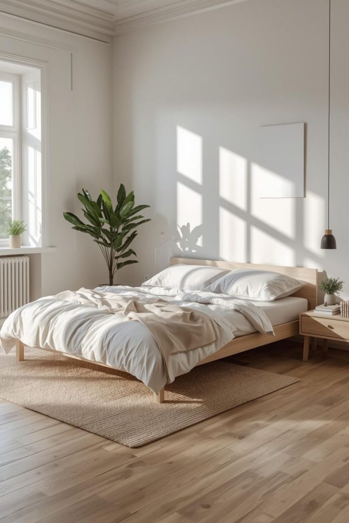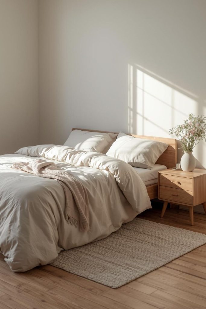 Adult bedroom ideas for women with a Scandinavian-inspired design focused on simplicity, light wood, and cozy textiles