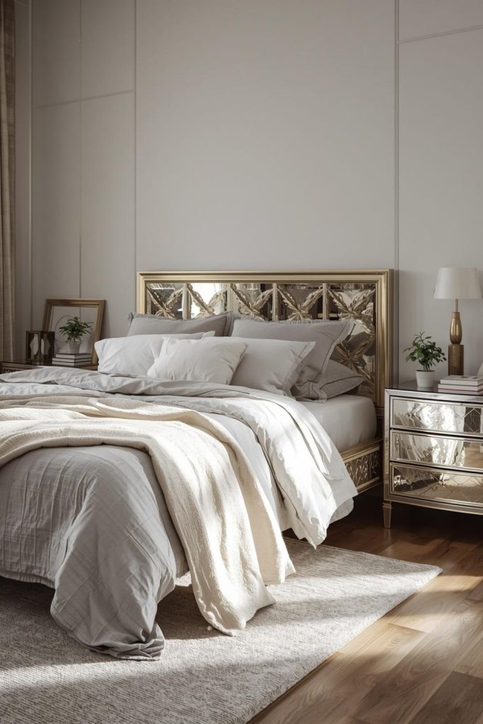 Mirrored furniture and metallic accents add brightness and a sense of luxury. Silver or gold touches on lamps, frames, or furniture enhance elegance. Pairing reflective surfaces with soft textiles and neutral tones balances glam with comfort. The result is a stylish bedroom that feels open, polished, and inviting.