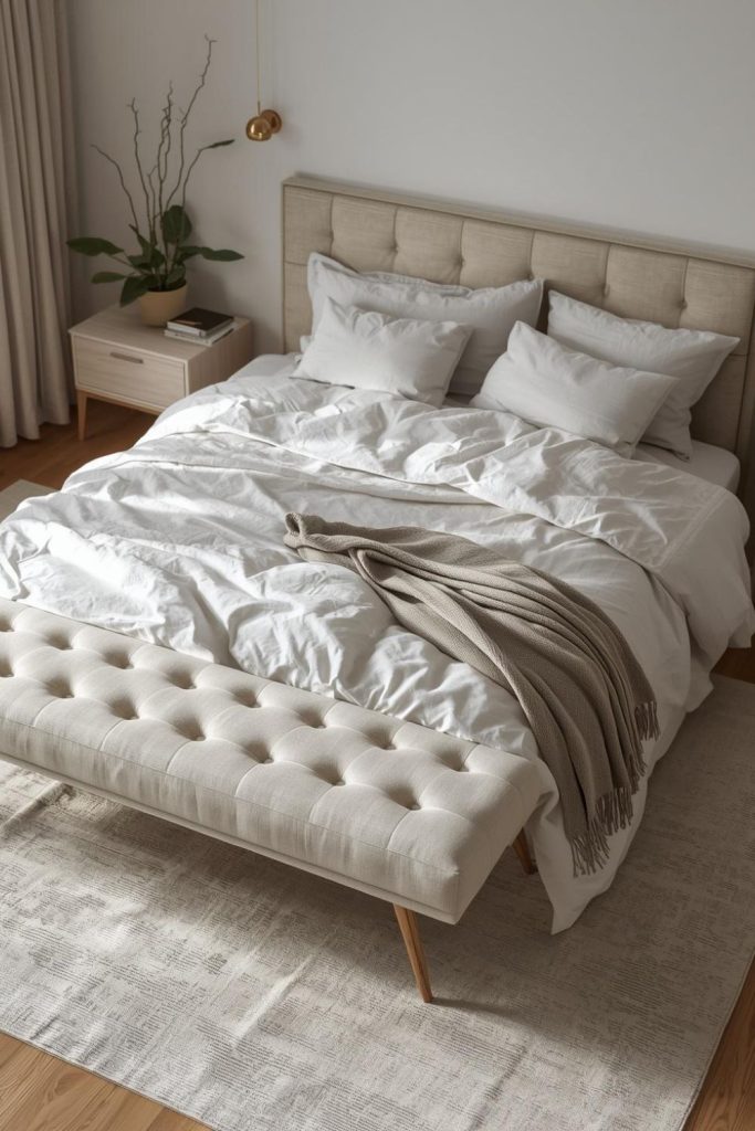 Adult bedroom ideas for women with a statement upholstered bench at the foot of the bed for added comfort and elegance