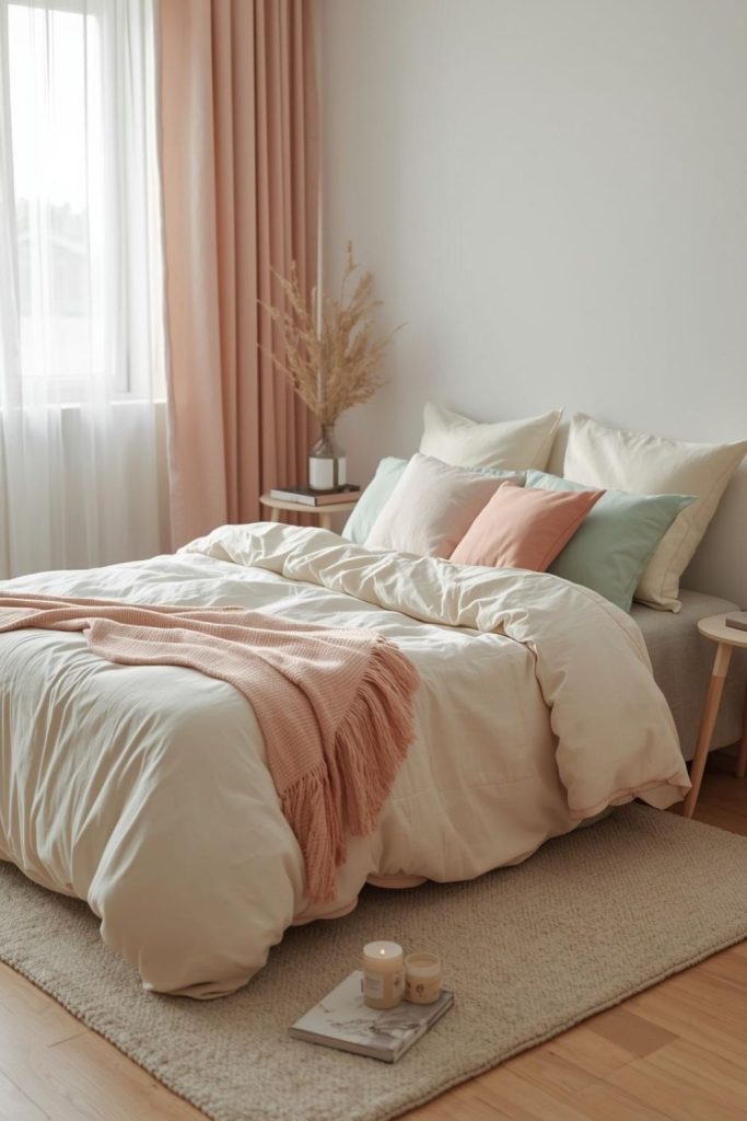 Soft pastel colors create a soothing and feminine atmosphere. Layered textures like throws, rugs, and cushions add visual interest while maintaining softness. Light-colored furniture complements the palette, keeping the room airy and bright. This combination results in a serene, comfortable, and elegant retreat perfect for relaxation and daily living.