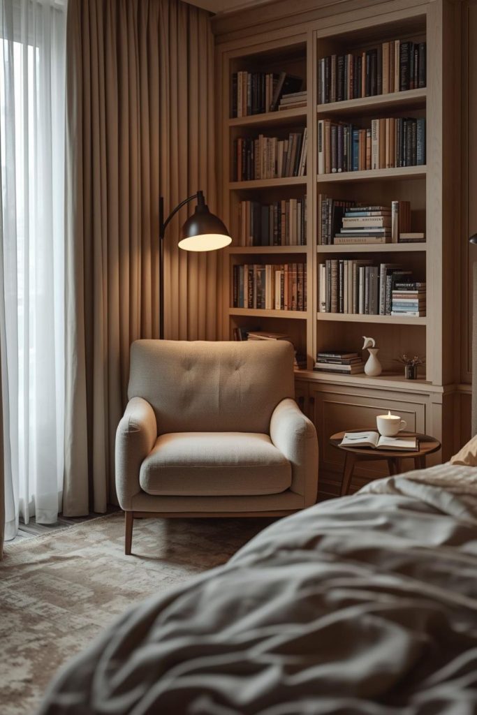 Adult bedroom ideas for women inspired by a cozy reading nook setup with a plush armchair, floor lamp, and built-in bookshelf