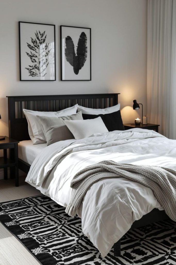 Adult bedroom ideas for women with a chic monochrome black-and-white theme elevated by textured fabrics and subtle patterns