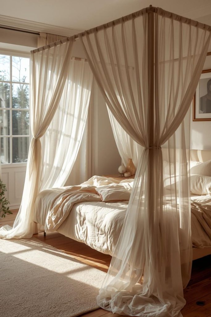 Adult bedroom ideas for women incorporating a canopy bed with sheer drapes for a soft, romantic, and airy feel