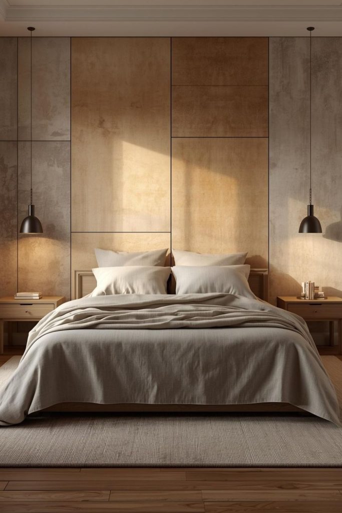 Warm terracotta and blush colors paired with natural wood and stone textures make a bedroom feel cozy yet elegant. Soft lighting enhances warmth, while minimal décor keeps the space open. Natural textiles, like linen or cotton, provide comfort and tactile interest. The combination results in a grounded and inviting retreat.