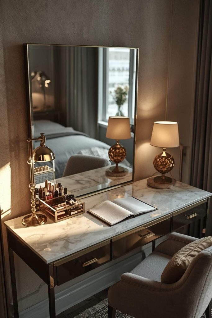 Adult bedroom ideas for women with a modern glam vanity corner featuring a sleek mirror, lighting, and organized beauty storage
